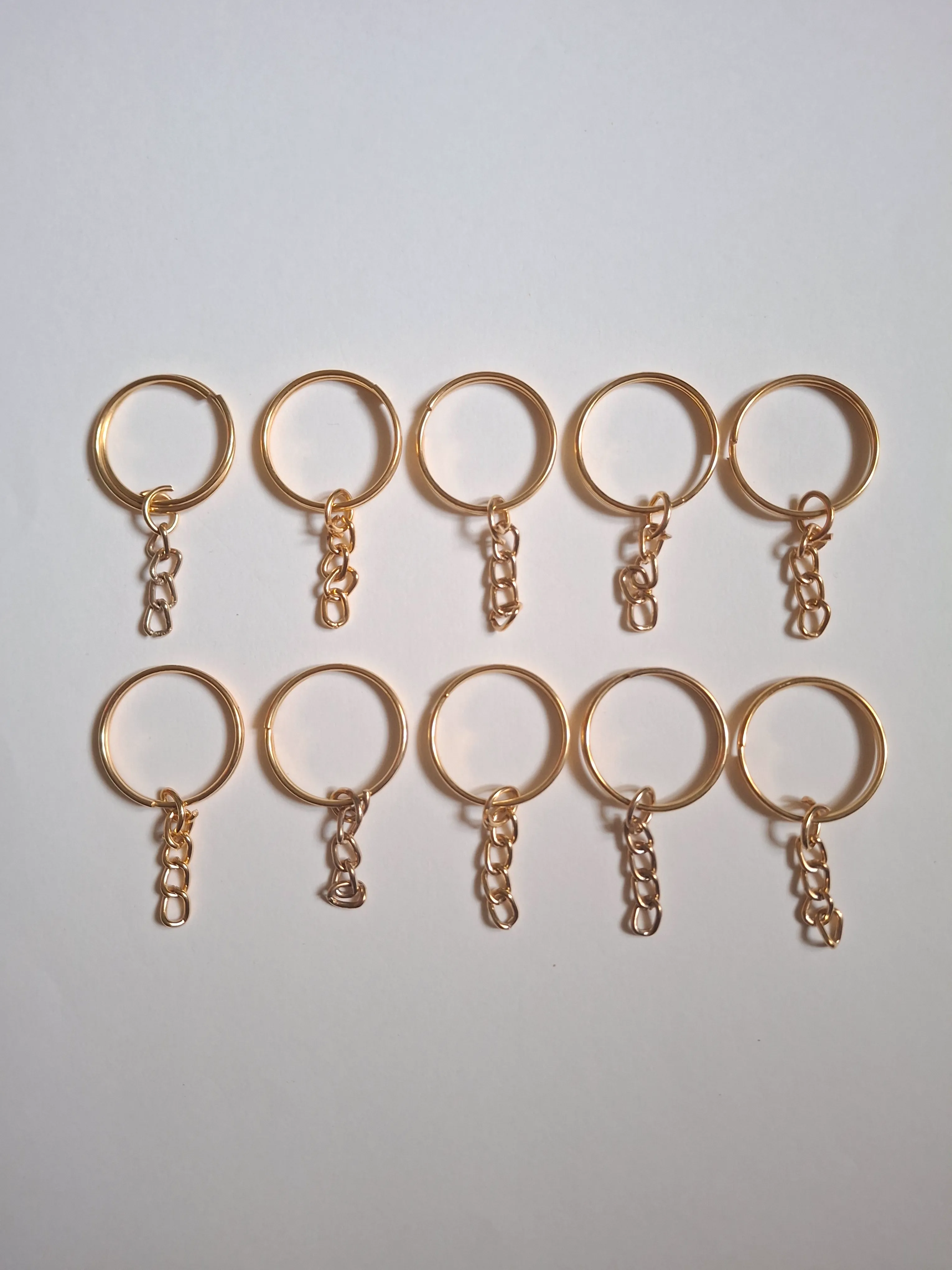 Smooth golden metal keyrings for attaching keys, charms, or accessories to your handmade crochet pieces.