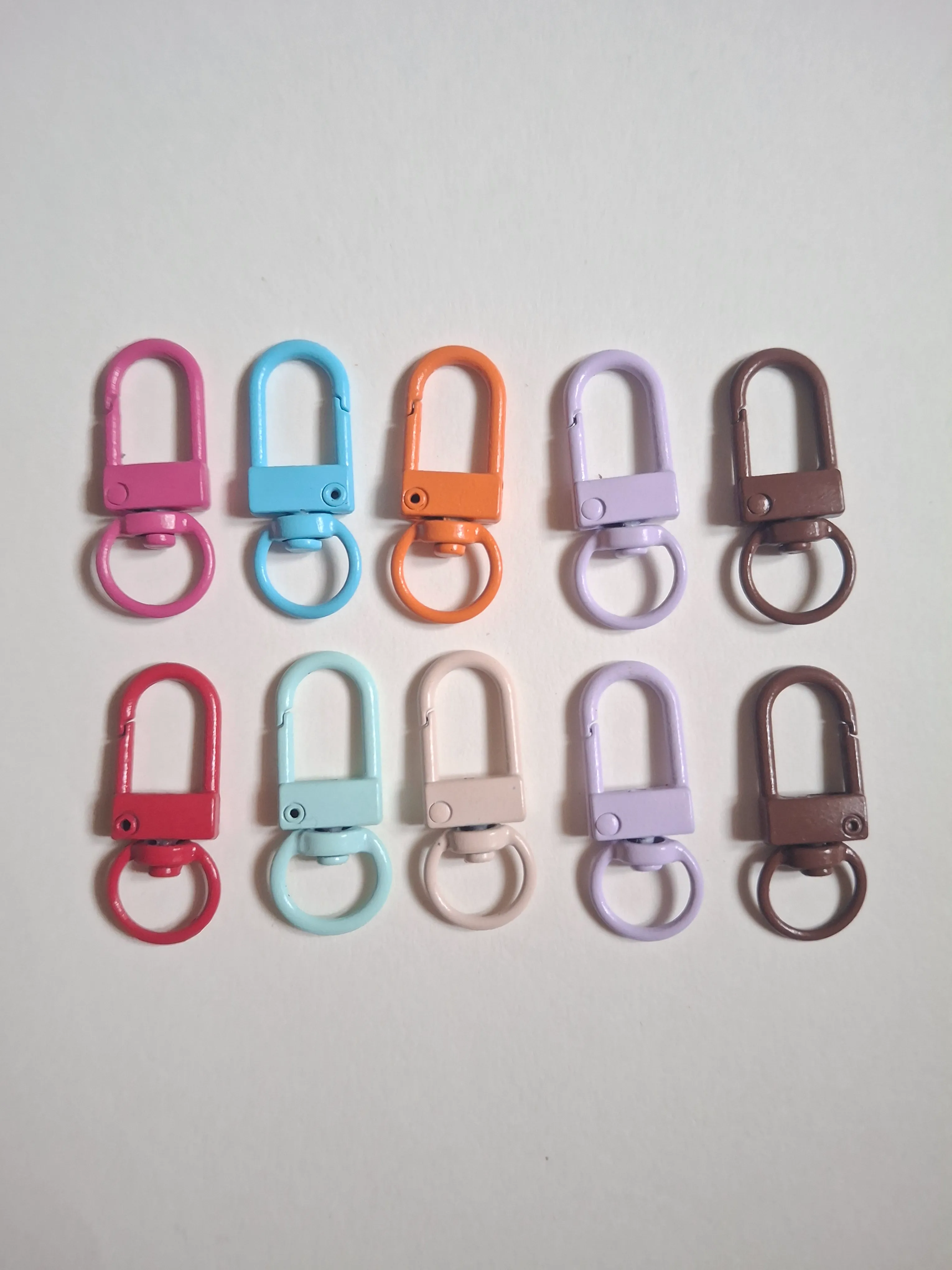 Eye-catching colorful metal swivel lobster claw hooks that add a playful, vibrant detail to crochet accessories.