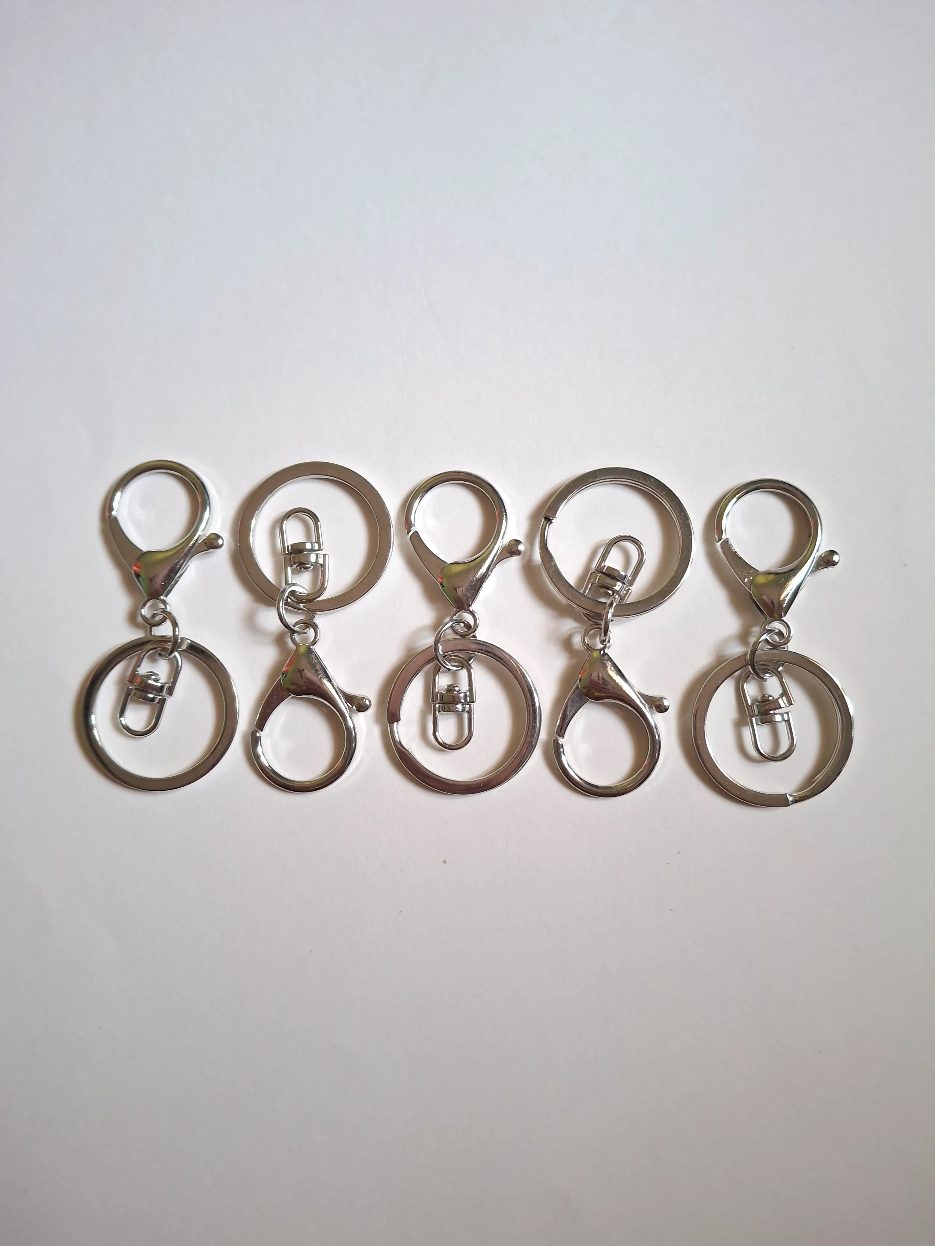 A sturdy silver metal lobster claw clasp for secure and easy attachment in crochet keychain and bag projects.
